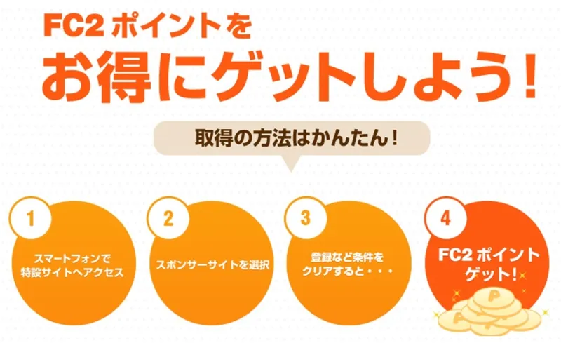 FC2ライブの無料ポイント獲得「特設サイト」にアクセス後、スポンサーサイトへの登録や条件をクリアすることで、無料でFC2ライブの有料視聴に必要な「FC2ポイント」を手に入れることができます。