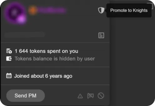 STRIPCHATでは、配信キャストのみが、視聴中の「アルティメット会員」のなかから自由に「ナイト(治安を維持する騎士:Knights)」を使命することができます。