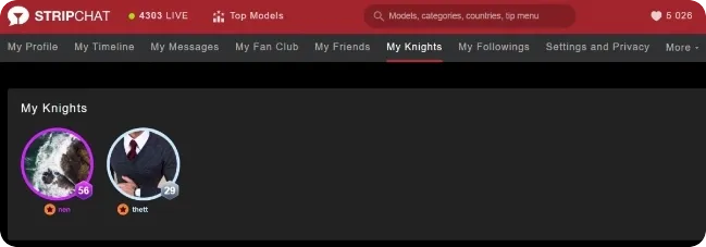 STRIPCHATのモデル登録・配信者になることで、STRIPCHATの「ナイト(騎士:Knights)」を指名することができます。モデルアカウントにログイン後「マイナイト:My Knights」の項目から、指名したナイトを一覧でみることができます。